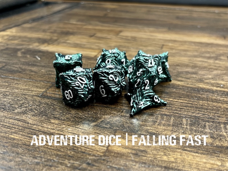 I don't cause commotions. I am one. Falling Fast metal dice set are black metal enamelled green with white numbers. $64.00