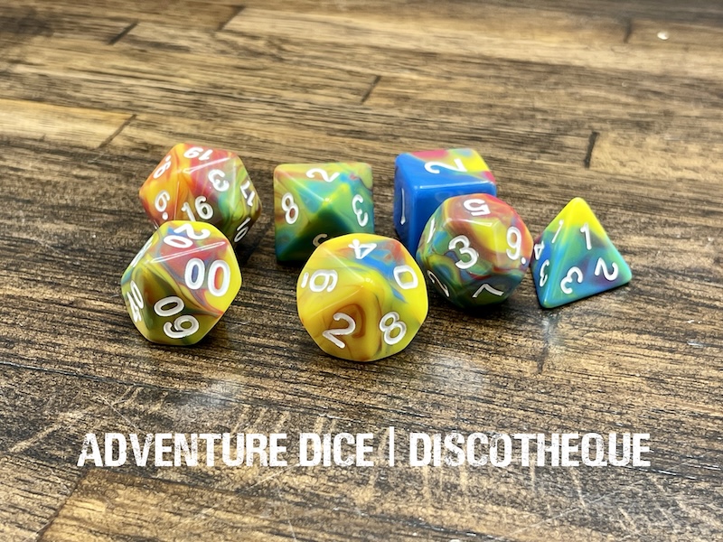 Discotheque polyhedral dice set are a swirl of opaque yellow, pink, and blue with white numbers.
