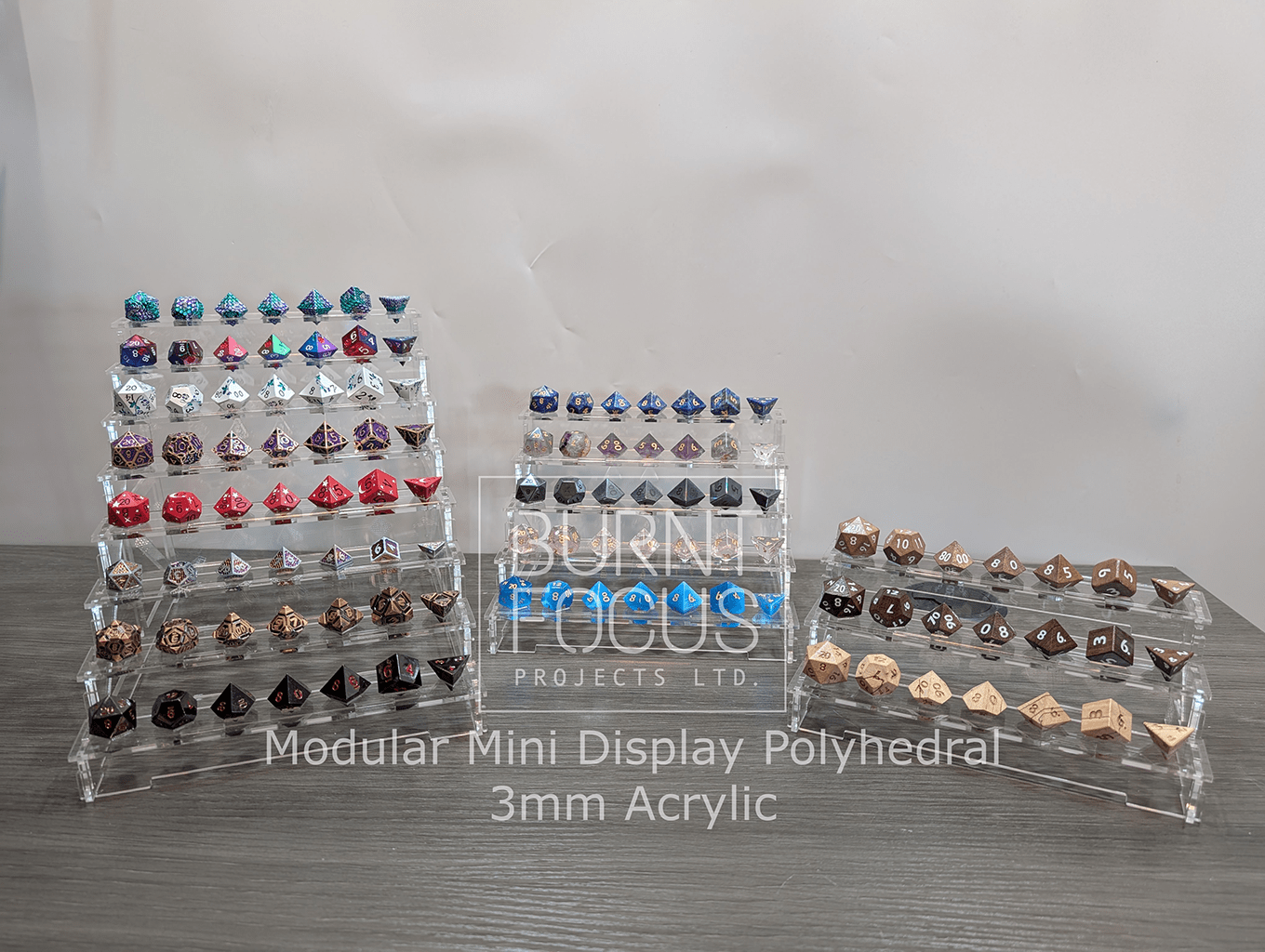 Want to highlight your dice? Our Modular Mini Display Polyhedral are designed to showcase a standard 7 piece polyhedral dice set. The top is cut to hold the set in descending order, D20 down through the D4, each position designed and cut to hold each die to make an eye catching display. When you want to do more than just sell some dice, present them!