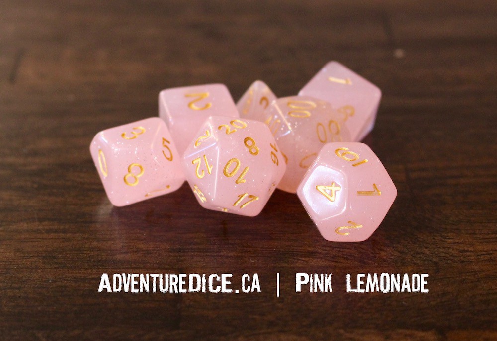Our Pink Lemonade dice feature a light pink colour with silver sparkles and gold numbering.