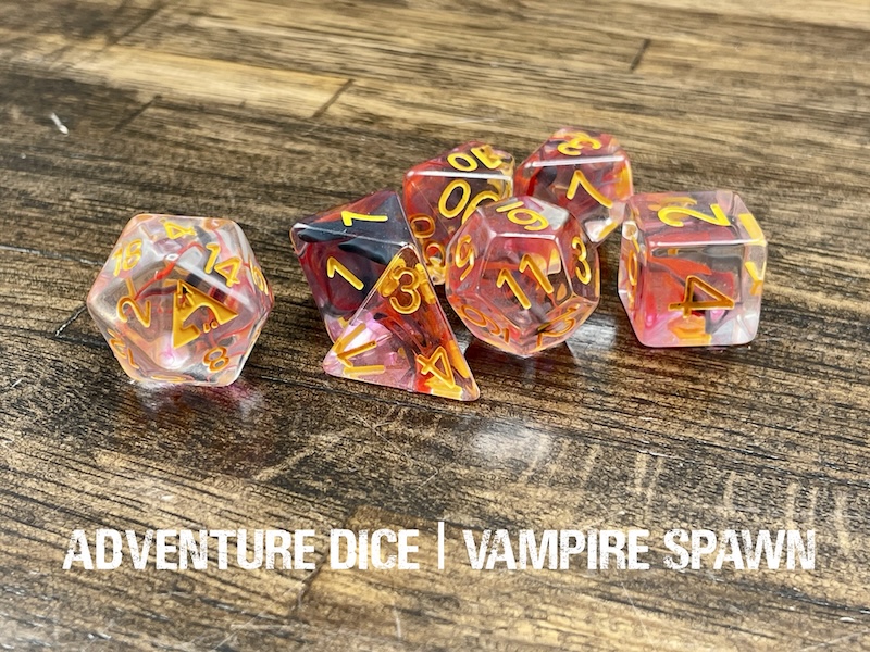Vampire Spawn polyhedral dice set are transparent clear with wisps of red and grey, with yellow numbers. This is an Adventure Dice Original dice set!